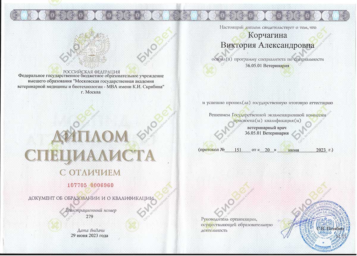 - Окончила Московскую ветеринарную академию со средним баллом 5,0, что позволило мне развить системный подход к организации лечебного процесса и умение выстраивать чёткие алгоритмы диагностики и терапии.